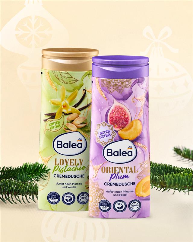 Balea Lovely Pistachio – Нежна и хранлива грижа. За сите љубители на слатките и нежни ароми, тука е лимитираната колекција Lovely Pistachio. Во оваа колекција ги имаме шампонот за коса, гелот за туширање и течниот сапун кои имаат неверојатно примамлив мирис на ф’стак. Производите од оваа линија кои во себе ги содржат витамините Б3 и Б6 ја хранат кожата и ја прават неодоливо мека.