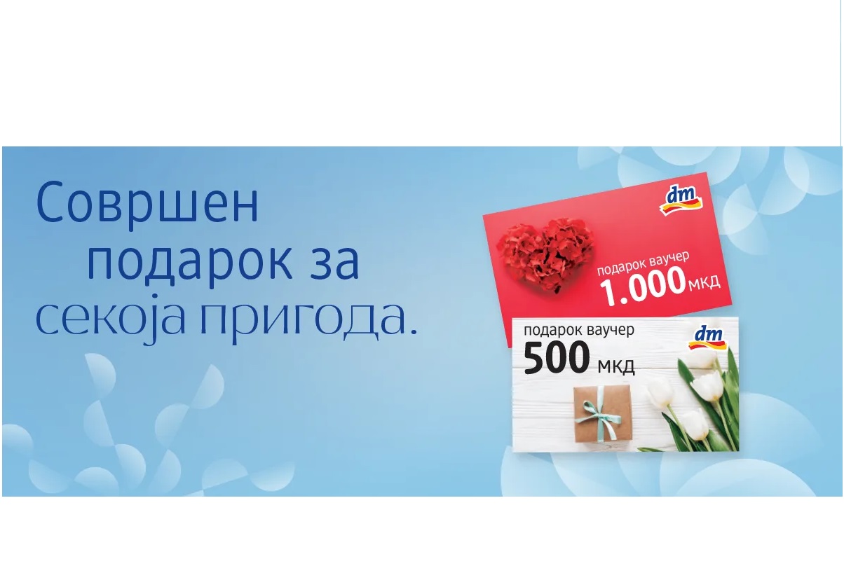Ви ги претставуваме подарок ваучерите од dm! Пристојни и компактни подарок ваучери во вредност од 500 и 1 000 ден, кои се совршен подарок за сите ваши колешки, партнерки, другарки, роднини или соработнички!