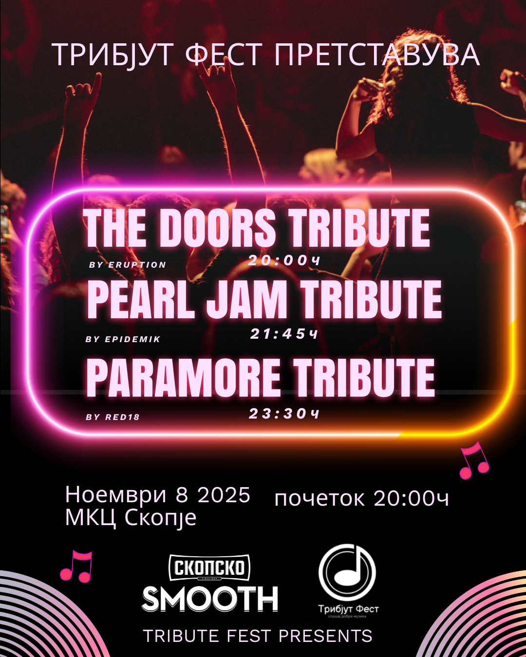 Оваа есен Скопје ќе пулсира во ритамот на легендите! На 8 ноември, во култниот Младински културен центар, ќе се одржи Трибјут Фест – музичка вечер посветена на бесмртните хитови и магијата на живите свирки што ги обележале генерациите.
